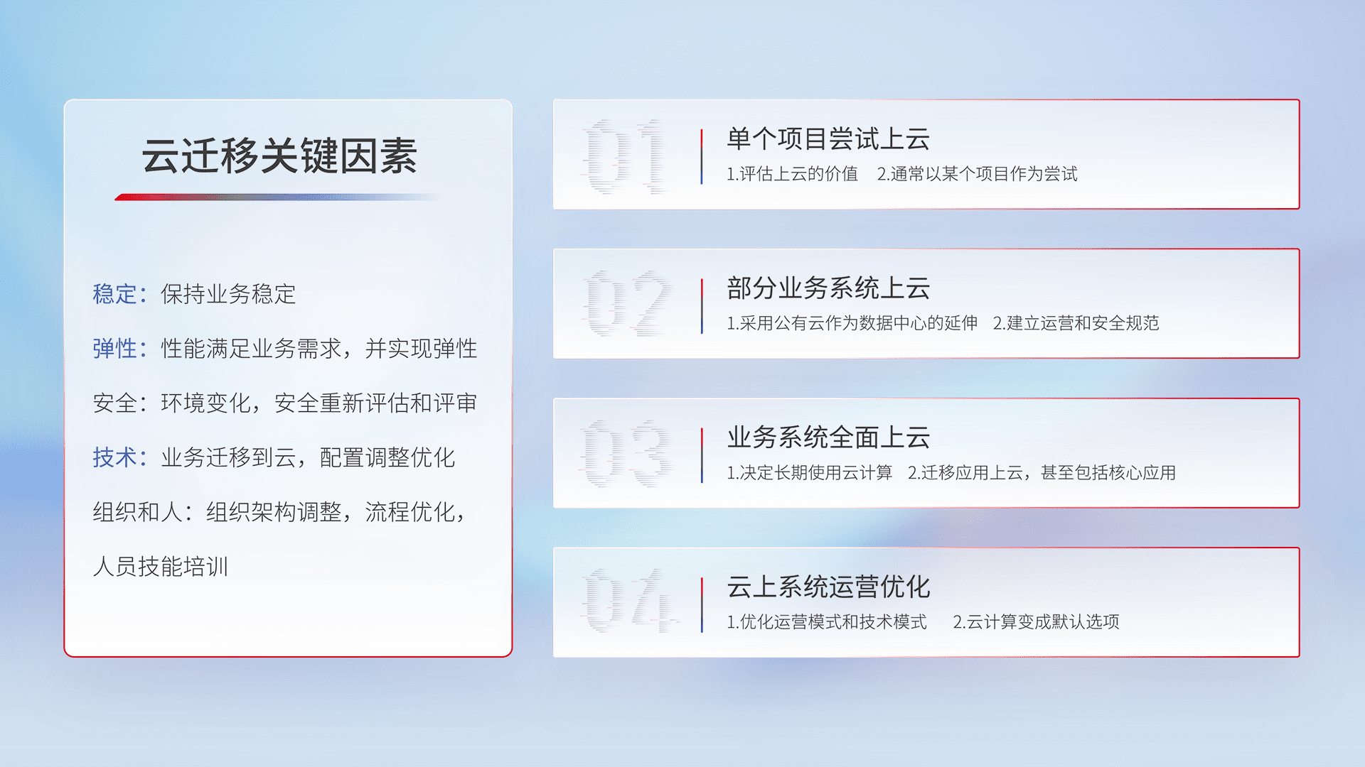 结合实际业务,,,从规划设计、、云平台选型、、、、云原生改造、、、、数据迁移、、、、集成交付,,,,迁移全过程为客户识别最佳上云路径,,,,做好风险识别管理,,,,设计网络架构、、身份权限、、安全审计合规、、操作审计、、日志审计、、、、监控告警策略、、、多站点容灾设计等,,,对云上基础设施进行整体规划,,提升IT治理水平,,,以满足弹性、、、、高可用、、、、高性能的需求。。。。